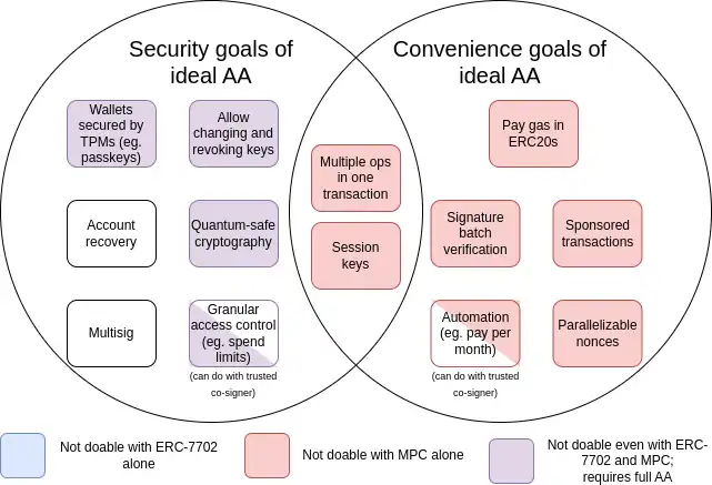 自 2015 年账户抽象提出以来,其目标也扩展到了包括大量「便利目标」,例如,某个没有 ETH 但拥有一些 ERC20 的账户能够用 ERC20 支付 gas。以下是这些目标的汇总图表: