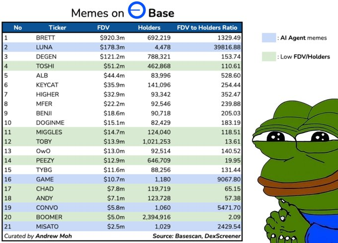 Base 链上梗文化的潜力,特别是在 2024 年 Q4 可能引领的「梗币超级周期」,为市场带来了新的机会和热点。随着 AI 和梗币的结合日益深入,Base 已成为比 Solana 更具吸引力的「Degen 玩法」新主场。在未来的布局中,投资者可以关注这些代币的社区支持和创新叙事,但仍需谨慎行事,做好自己的研究(DYOR),以更好地把握潜在机遇。